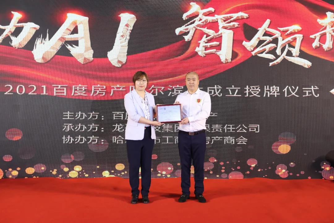 百度房產(chǎn)運營負責人劉悅為龍采科技集團高級副總裁、黑龍江管理區(qū)大區(qū)總經(jīng)理王曉磊親自授牌。哈爾濱地區(qū)房產(chǎn)精英齊聚一堂,共同見證這一重要時刻。
