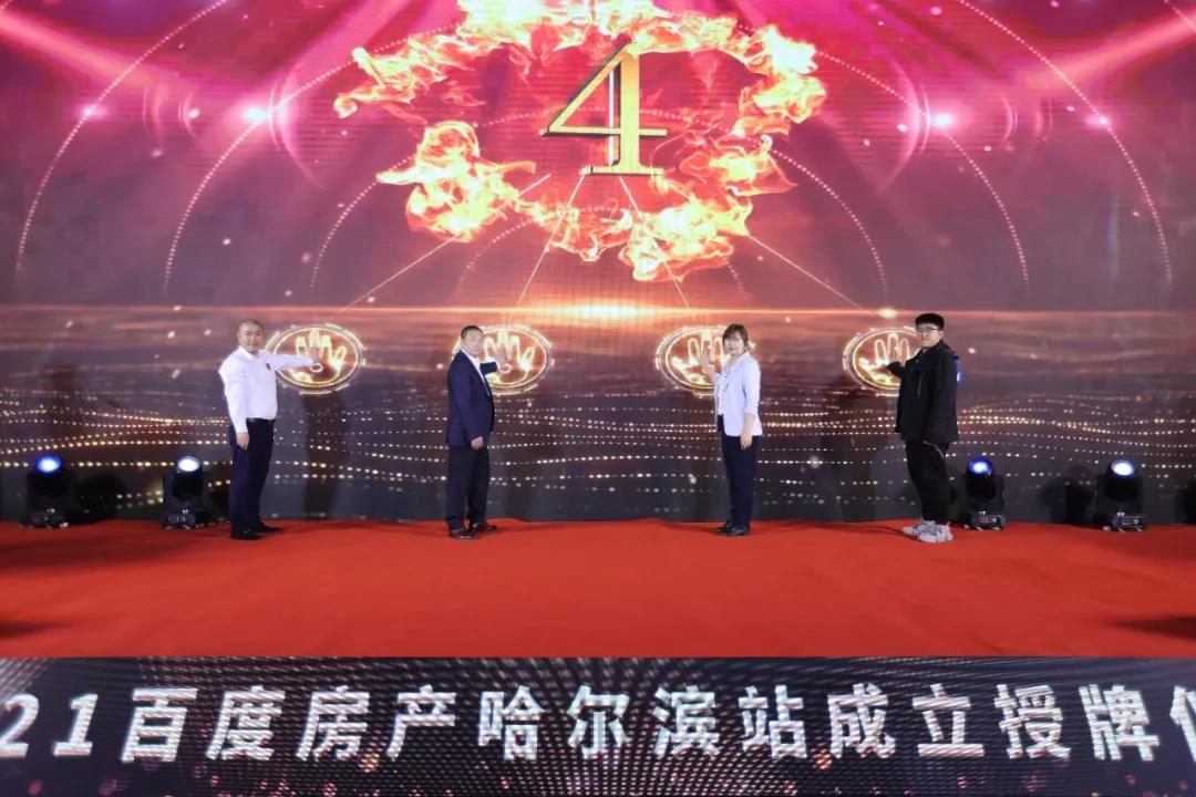 黑龍江省工商聯(lián)總商會副會長、黑龍江省房地產(chǎn)商會副會長、黑龍江省寧波商會會長、宏仁集團董事長楊昌仁,百度黑龍江渠道經(jīng)理丁釗 ,百度房產(chǎn)運營負責人劉悅 ,龍采科技集團高級副總裁、龍采科技集團黑龍江管理區(qū)大區(qū)總經(jīng)理王曉磊,匯智成功地產(chǎn)厲春杉上臺,在倒計時中共同啟動授牌儀式。共同來見證2021百度房產(chǎn)哈爾濱站成立。