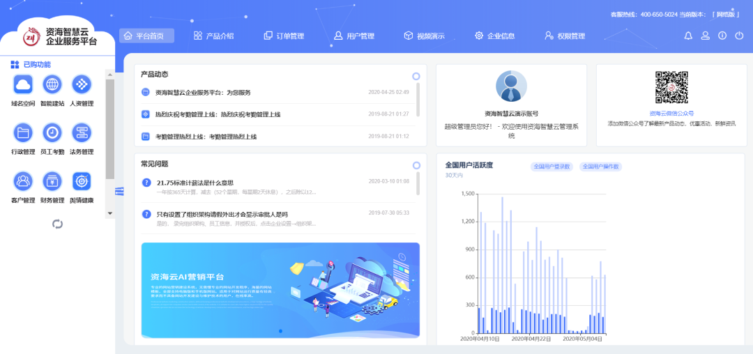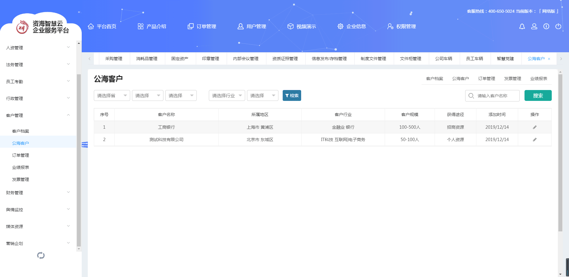 此次研發的資海智慧云服務平臺,是數字化、智能化和集成化平臺,利用先進的互聯網中臺概念,集合集團管理運營、技術研發、大數據分析與挖掘能力,對各業務前臺形成強力支撐。提供基礎服務、管理服務、營銷服務等多種通用行業SaaS服務,為中小企業數字化轉型賦能,是面對中小企業管理、營銷上的高效助力工具。打通平臺與客戶之間的距離,打造真正的一站式互聯網服務。