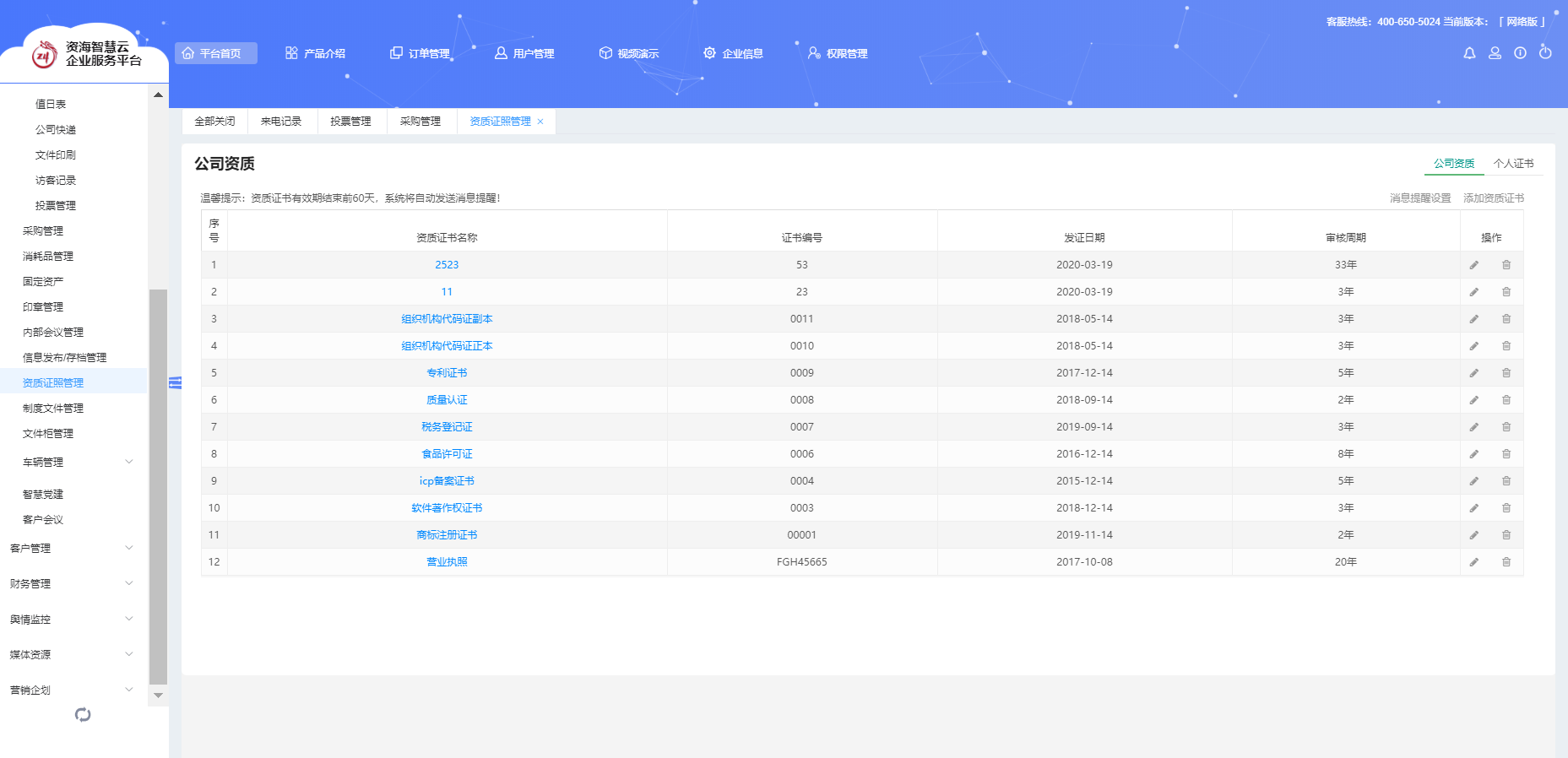 資產物料管理、文件柜管理、采購管理、資質證照管理、印章使用管理、文件打印管理、會議管理、制度文件管理、信息發布/存檔管理、車輛管理。
