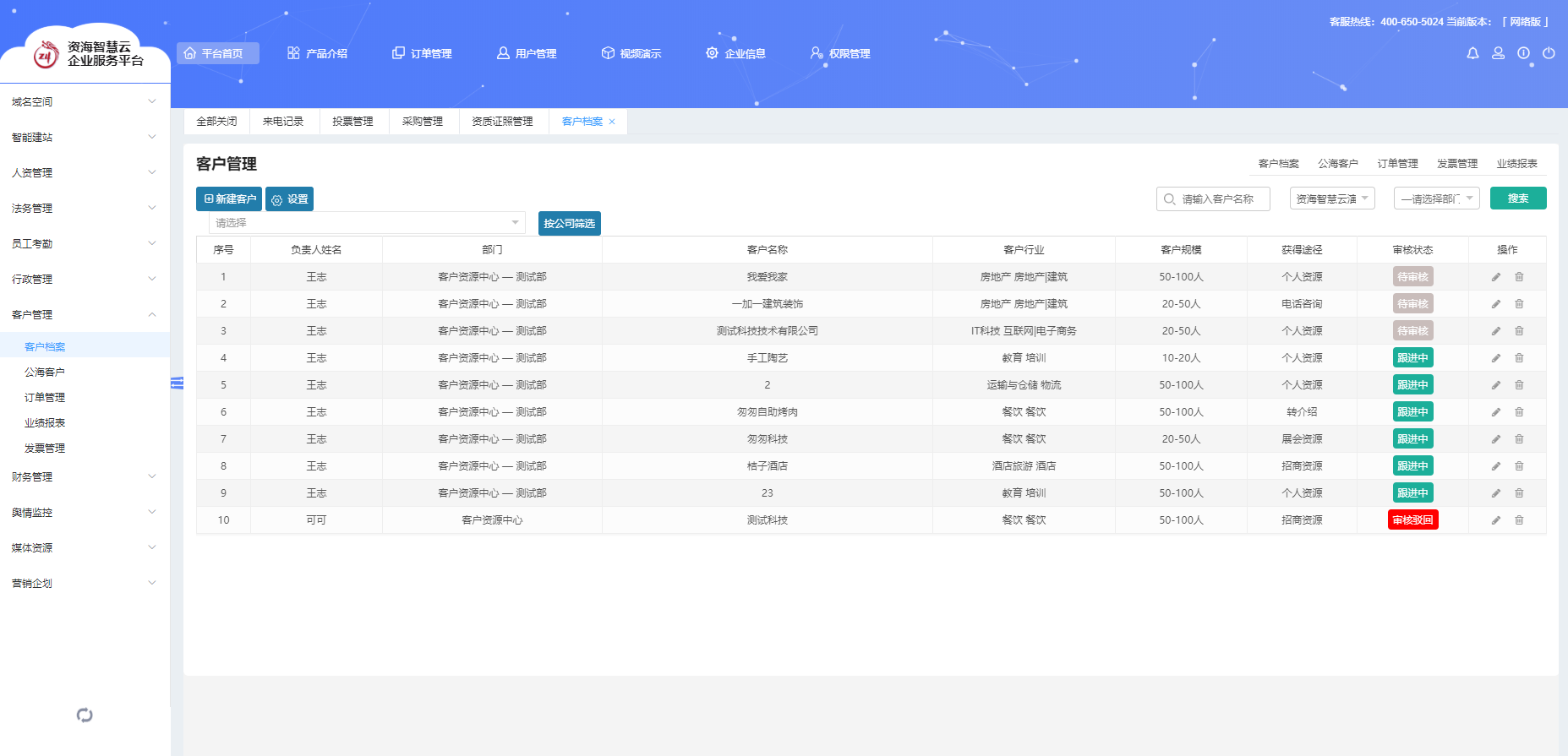客戶檔案、公海客戶、訂單管理、發票管理、營銷線索管理、業績報表。