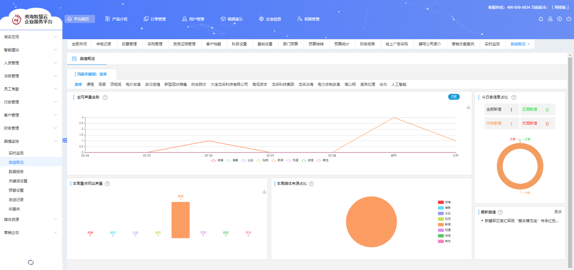 為更好地助力中小企業健康高效復工復產,中國互聯網百強企業——龍采科技集團疫情期間快速研發,5月11日,網站后臺全新升級——SaaS級企業辦公管理平臺正式上線!平臺全面覆蓋企業運營各環節功能,服務衍射全國40余城市,依托互聯網科技助力賦能各行業穩步運營,極大提高企業管理營銷效率,實現智慧生產。