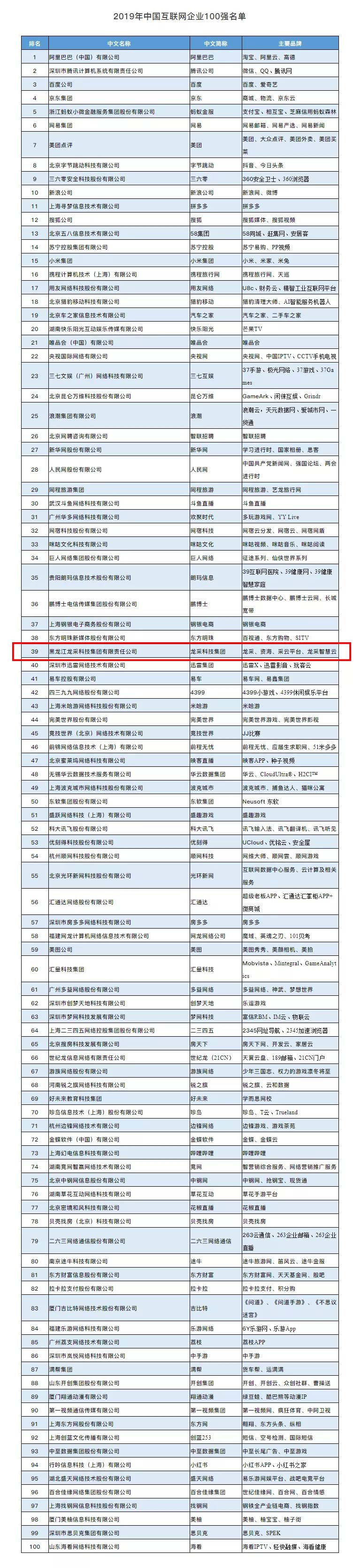 龍采科技集團以其卓越的技術研發實力及創新能力,一舉躍升至中國互聯網百強榜單第39位,系黑龍江省唯一入選企業,這也是龍采科技集團連續第五年躋身百強榜單。2015年第88位、2016年第86位、2017年第49位、2018年第44位、2019年第39位!五年來,龍采用實力向客戶向市場證明著自己的專業與務實,一年一個堅實的腳印,穩步向著美好的互聯網愿景邁進。